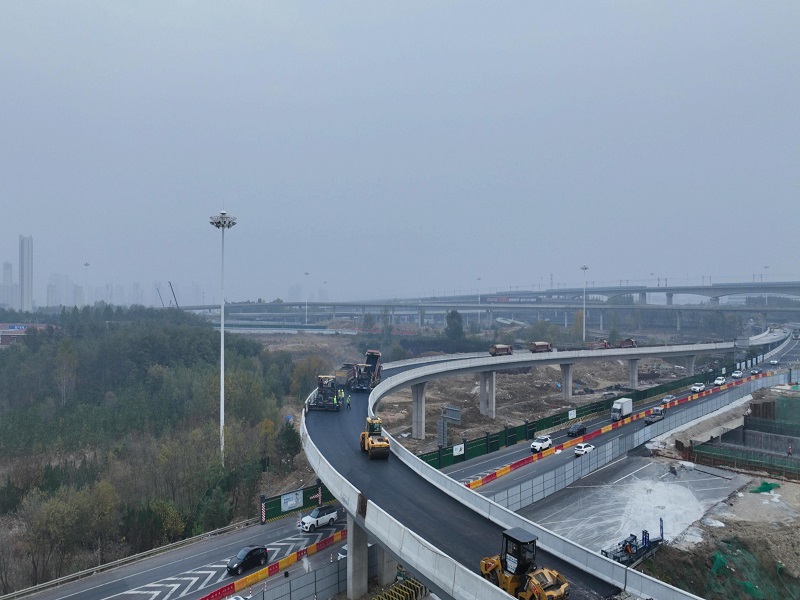 11月7日,第三公司轸格庄立交施工项目B匝道桥钢箱梁桥面高粘高弹改性沥青摊铺工作顺利完成。